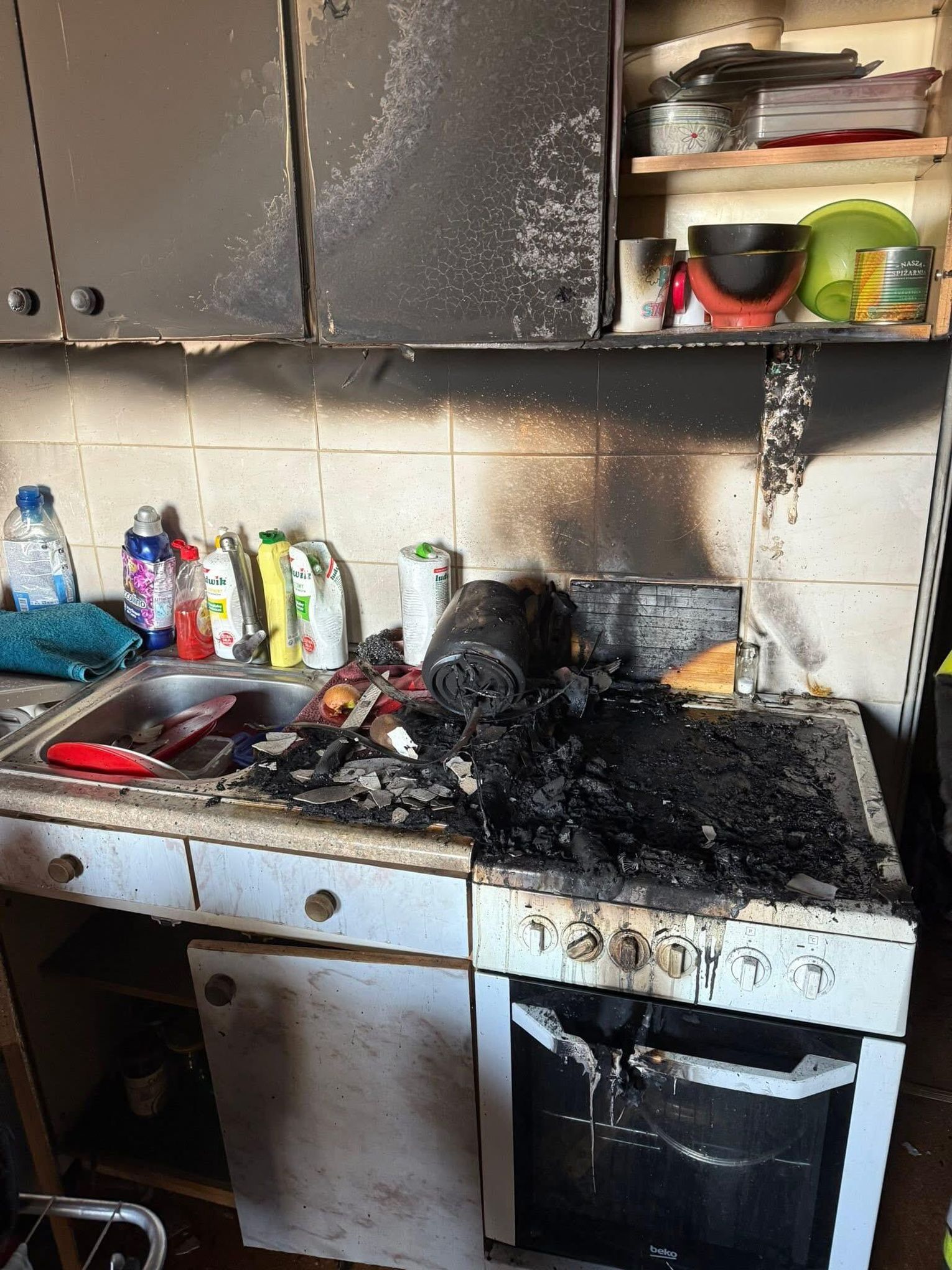 Ogień objął część kuchenną lokalu, a dym okopcił ściany w całym mieszkaniu. Strażacy ugasili pożar, oddymili pomieszczenia i wynieśli nadpalone elementy wyposażenia. Dokładnie sprawdzili również budynek, aby wykluczyć dalsze zagrożenia.