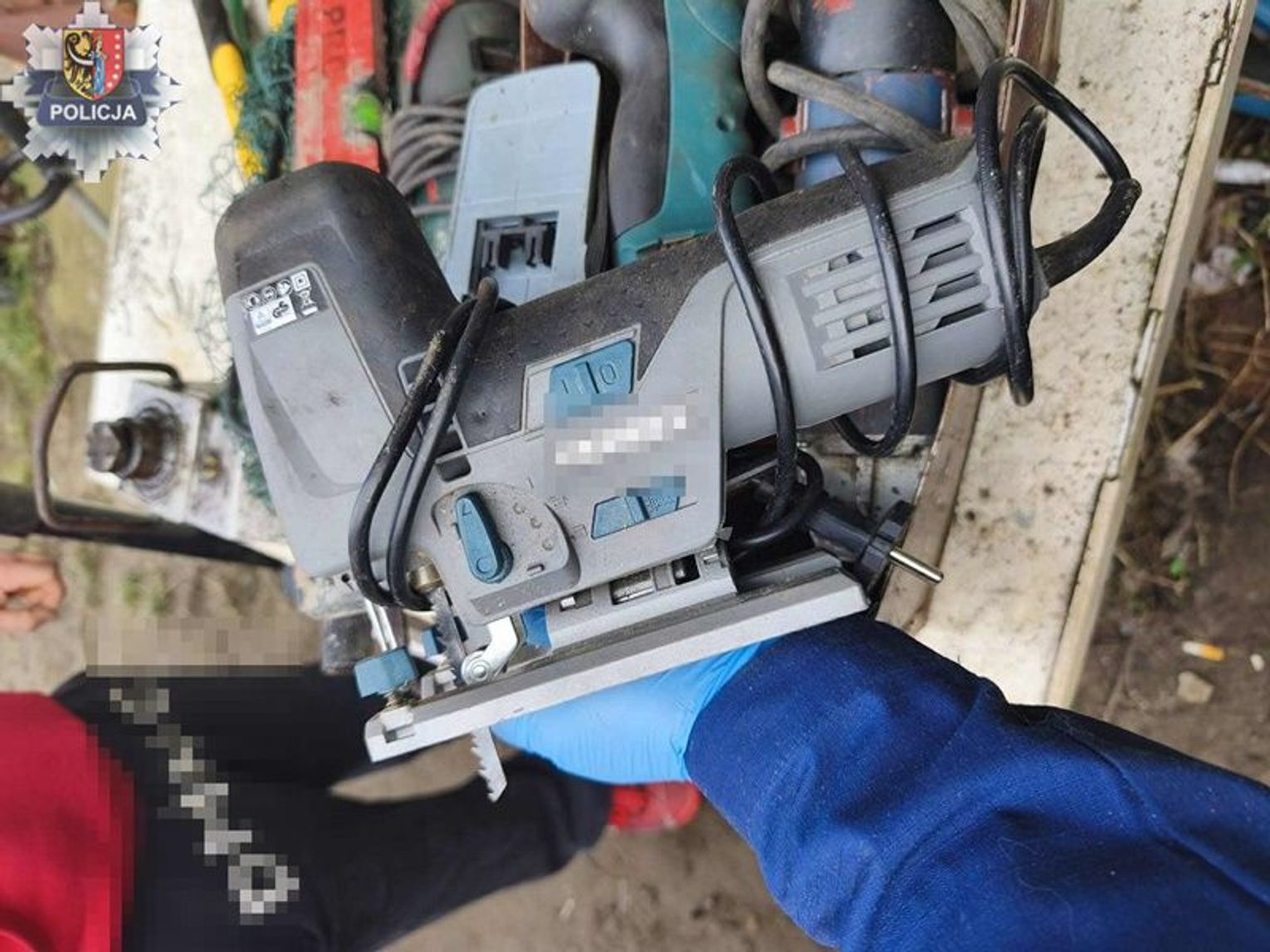 Podczas przeszukania lokalu zajmowanego przez mężczyznę funkcjonariusze od razu odnaleźli sprzęt do wykonywania tatuaży pochodzący z jednego z włamań. W kolejnych pomieszczeniach natrafili na więcej skradzionych przedmiotów — tablety, odkurzacze, liczne narzędzia oraz katalizator z tłumikiem, wycięty wcześniej z mercedesa mieszkańca Przemkowa.