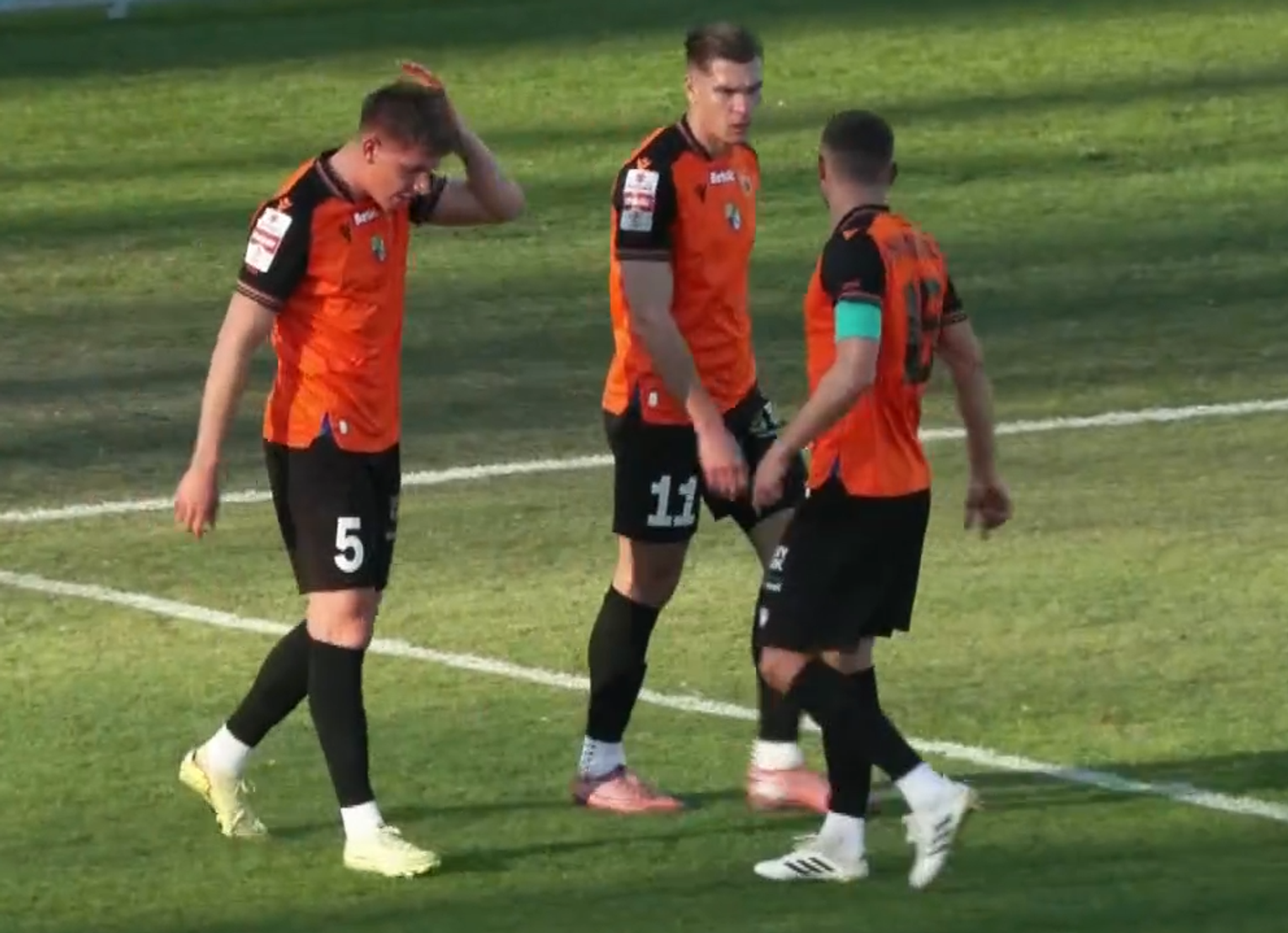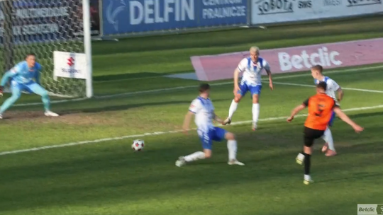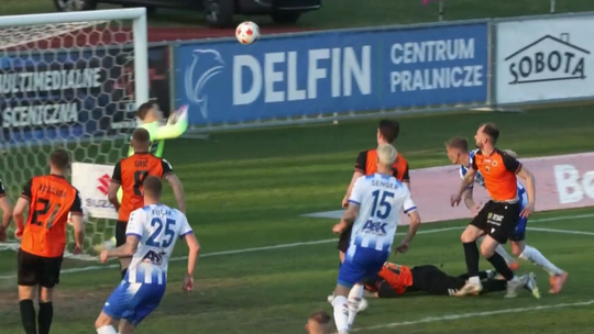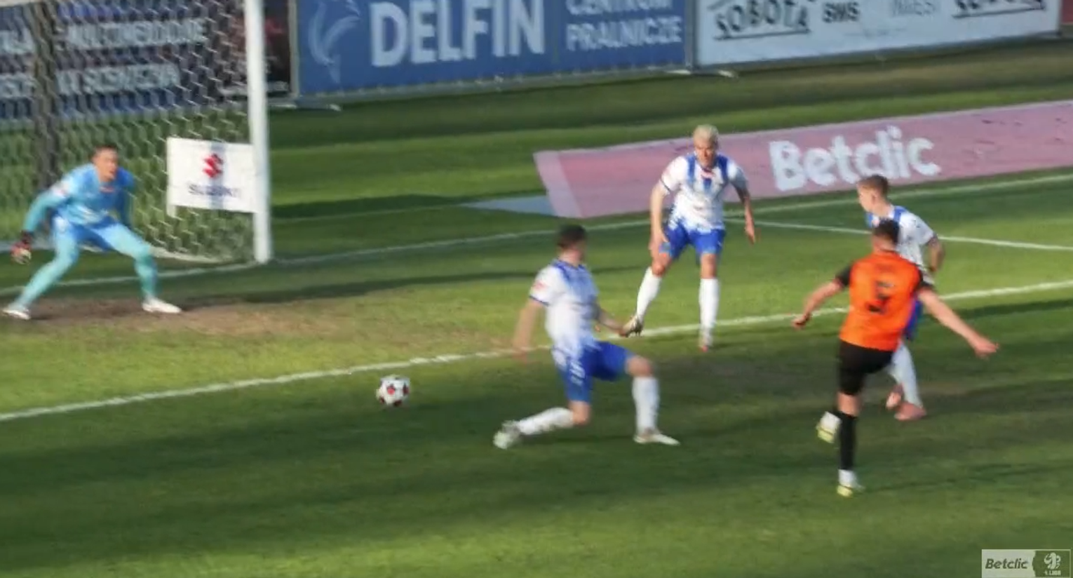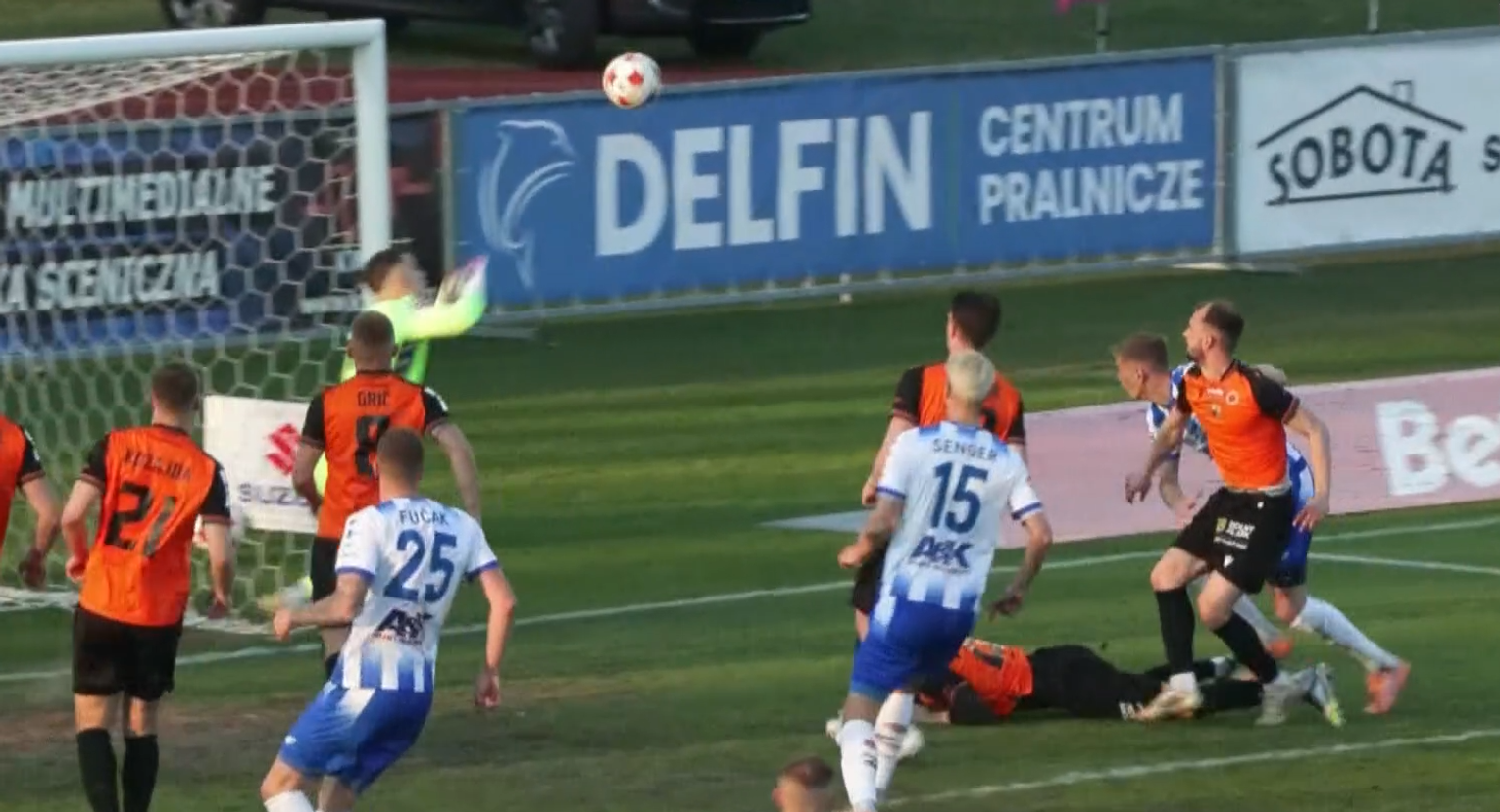 39. minuta: z pozoru niewinna akcja lewym skrzydłem Stali, Kamil Cybulski próbuje dośrodkować wzdłuż lini, a Jakub Grić interweniuje nieszczęśliwie wbijając piłkę do własnej bramki: 1:2.